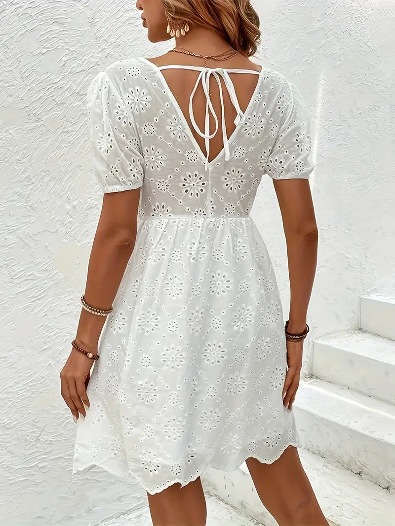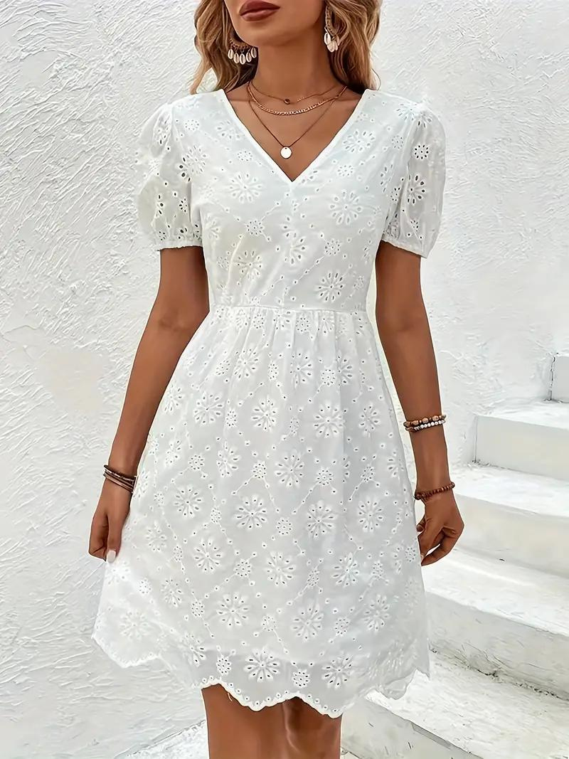 Gönnen Sie sich zeitlose Eleganz mit unserem mit Ösen bestickten V-Ausschnitt-Kleid, einem Meisterwerk, das Raffinesse und Charme nahtlos miteinander verbindet. Dieses mit viel Liebe zum Detail gefertigte Kleid besticht durch seine zarte Ösenstickerei, die über den Stoff tanzt und einen ätherischen und fesselnden Look kreiert.