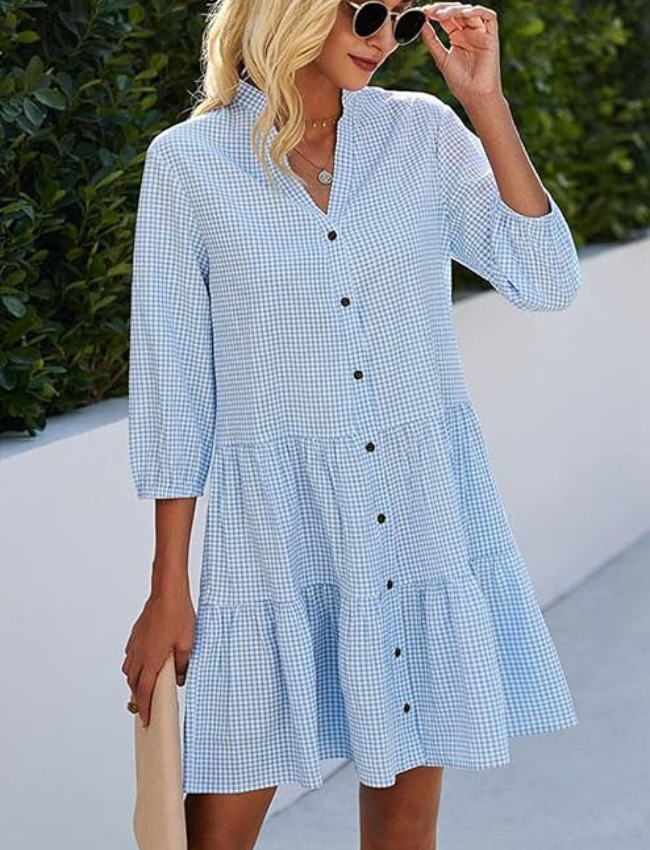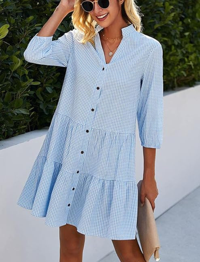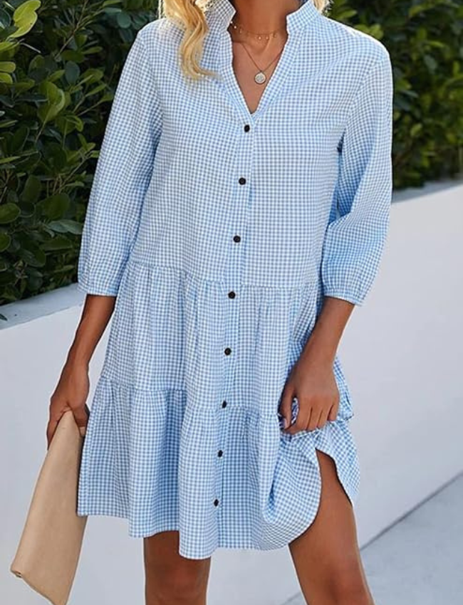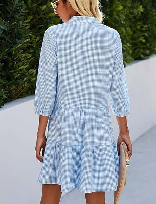 Das Kleid ist aus hochwertigem Stoff gefertigt, der sich angenehm auf der Haut anfühlt und den ganzen Tag über für Komfort sorgt. Der Stehkragen verleiht dem Kleid einen Hauch von Eleganz, während das Karomuster eine schicke Ausstrahlung hat, so dass es sich sowohl für legere Ausflüge als auch für formelle Anlässe eignet. Kombinieren Sie es mit Absätzen für einen eleganten Bürolook oder mit Sneakers für ein lässiges Ensemble am Wochenende.